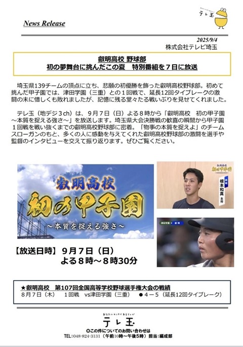 クラブ活動 硬式野球部 テレ玉で特別番組が放送されます。 2025.09.06 第107回全国高校野球選手権埼玉大会で優勝し、甲子園に初出場した叡明高校野球部の今夏の軌跡を振り返る特別番組「叡明高校 初の甲子園~本質を捉える強さ~」が放送されます。「物事の本質を捉えよ」のチームスローガンのもと埼玉県大会から甲子園1回戦を戦い抜いた叡明高校野球部に密着し、選手や監督のインタビューを交えて激闘を振り返る内容となっています。 放送時間9月7日(日)、20:00~20:30放送局テレビ埼玉 (https://www.teletama.jp/) 一覧へ戻る