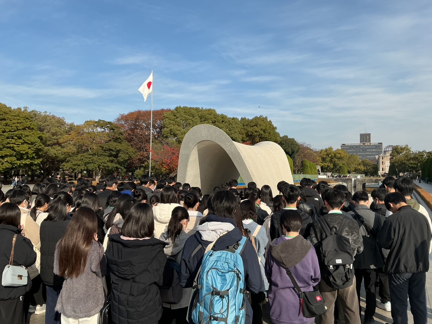 その後、原爆慰霊碑の前で献花と戦没者への哀悼の意を込めて黙祷を捧げました。